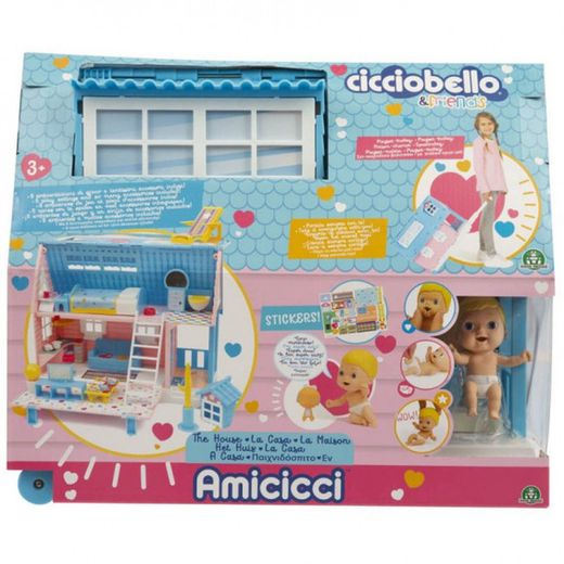 ¡Ha llegado la casa de los amigos! Descubre todos los accesorios para jugar con Cicciobello y su cachorro y los adhesivos para decorar la casa. Amicicci son unos pequeños bebés muy flexibles hechos de un material blandito y divertido. La casa tiene muchos ambientes de juego: salón, dormitorio, jardín, baño solar y unas escaleras que lleva a dos pisos para una doble diversión. La casa se convierte en un trolley para que puedas llevarla siempre contigo. Incluye: una figura Amicicci, mascota, accesorios y pegatinas para decorar la casa. Medidas: 43x17x36 cm